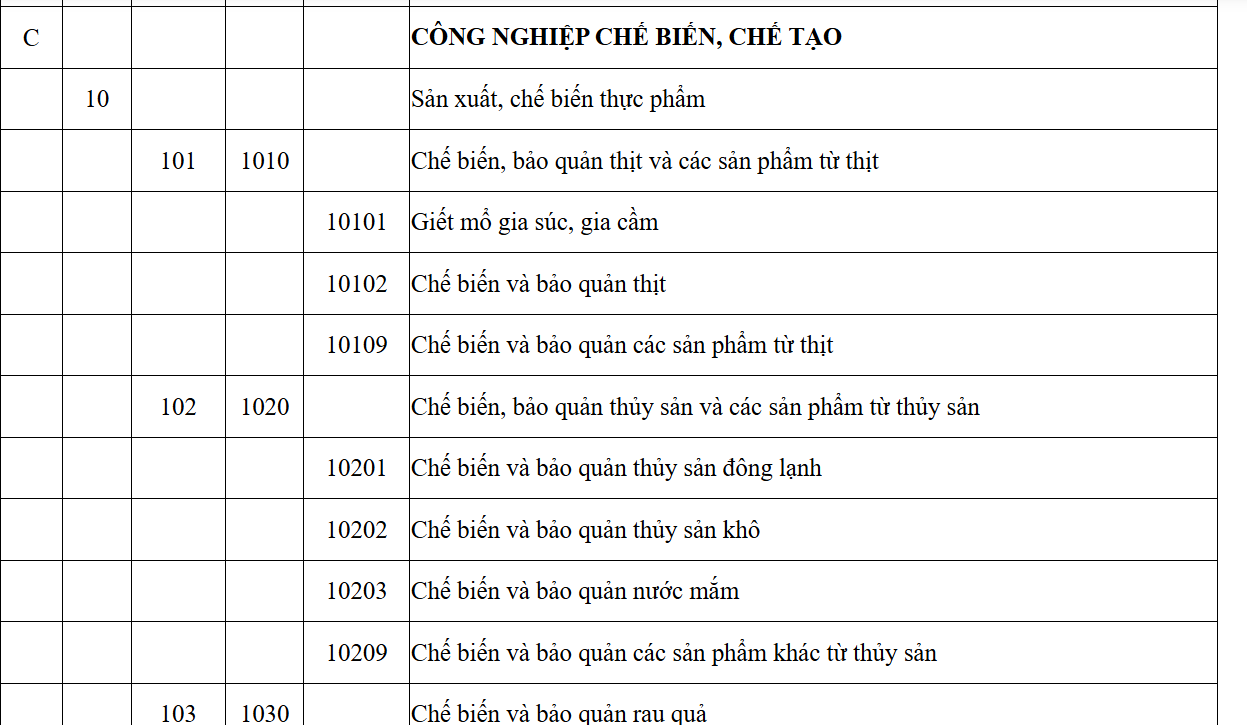 Ảnh chụp một phần bảng tra cứu mã ngành kinh doanh mới nhất năm 2025