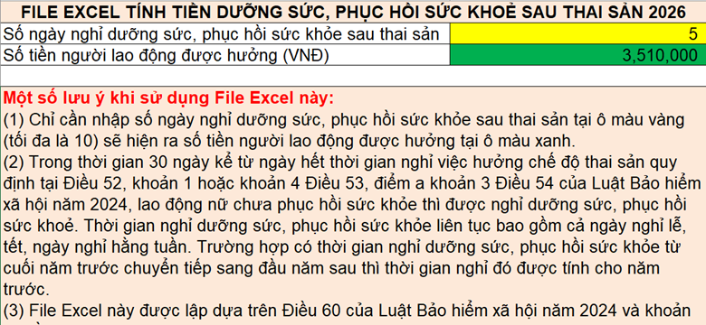 3. Hướng dẫn sử dụng File Excel tính tiền dưỡng sức, phục hồi sức khoẻ sau thai sản 2026