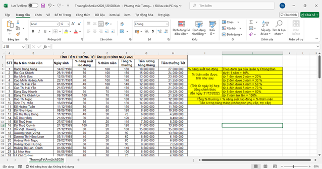 File Excel tính tiền thưởng Tết Âm lịch Bính Ngọ 2026 cho người lao động