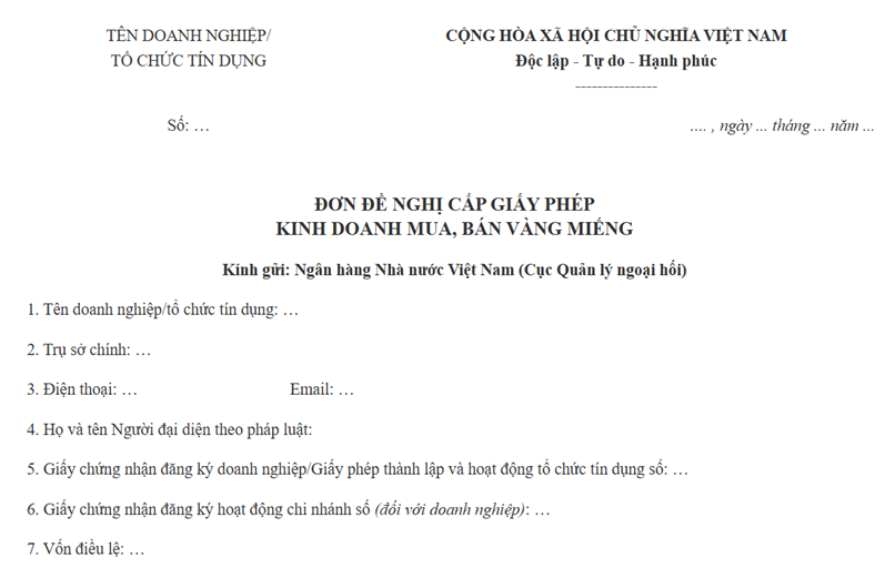 Mẫu Đơn đề nghị cấp giấy phép kinh doanh mua, bán vàng miếng