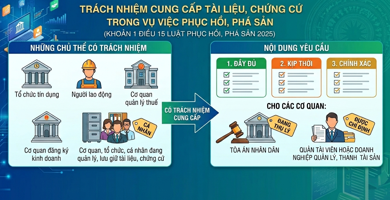 Một trong những rào cản lớn nhất khi giải quyết một vụ án kinh tế là sự bất đối xứng thông tin. Nhiều trường hợp các bên cố tình che giấu tài sản hoặc làm sai lệch hồ sơ kế toán để trục lợi. Nhằm khắc phục tình trạng này, khoản 1 Điều 15 Luật Phục hồi, phá sản 2025 quy định rõ ràng về trách nhiệm của các cơ quan, tổ chức, cá nhân đang quản lý, lưu giữ tài liệu, chứng cứ có liên quan đến vụ việc phục hồi, phá sản.